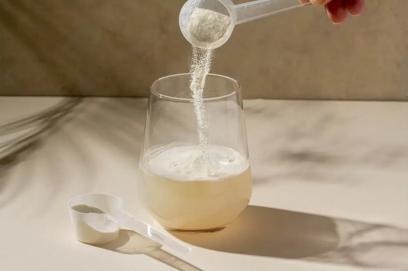 Pridajte 5 g každého produktu (Vitamín C, Horčík, Vápnik, B komplex a Vitamín D3) do pohára vody, dobre premiešajte a vypite.