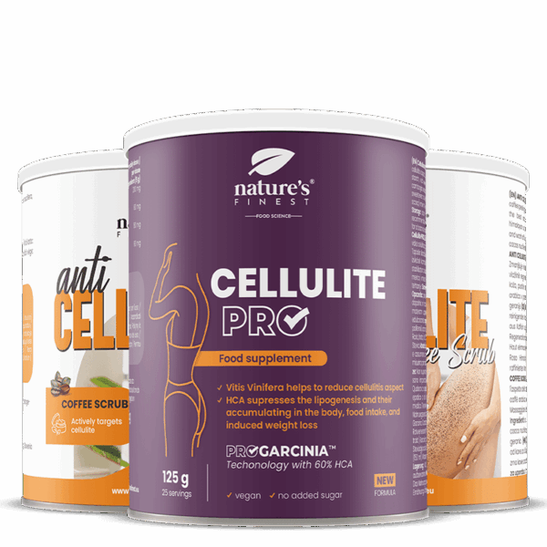 Celulitída PRO: S ProGarcinia™ a extraktom z červeného vína vám táto receptúra ​​proti celulitíde pomáha formovať postavu, potláčať návaly hladu a redukovať viditeľnú celulitídu! S kávovým peelingom Anti Cellulite sa môžete zbaviť celulitídy jednoduchým a prirodzeným spôsobom. Pôsobí aj na extrémne problematické partie, kde sú tukové vankúšiky najodolnejšie.