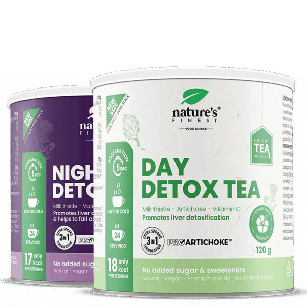 • Denný detoxikačný čaj: S extraktom ProArtichoke™, bodliakom, bielym čajom a vitamínom C – podporuje detoxikáciu organizmu, pomáha pri nadmernom chudnutí, čistí pečeň a zlepšuje trávenie.