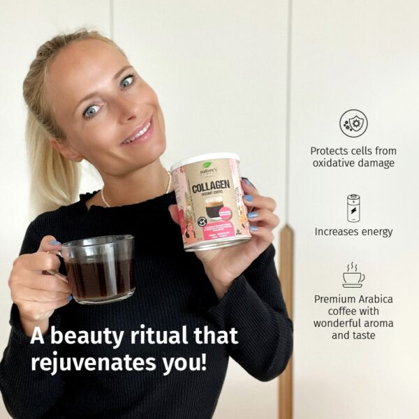 Táto lahodná kávová zmes s aktívnymi zložkami kolagénom, kyselinou hyalurónovou, biotínom a vitamínom C pomáha zvyšovať pružnosť pokožky a znižuje výskyt vrások. Kofeín z kávy a guarany zvýši energiu a bdelosť.