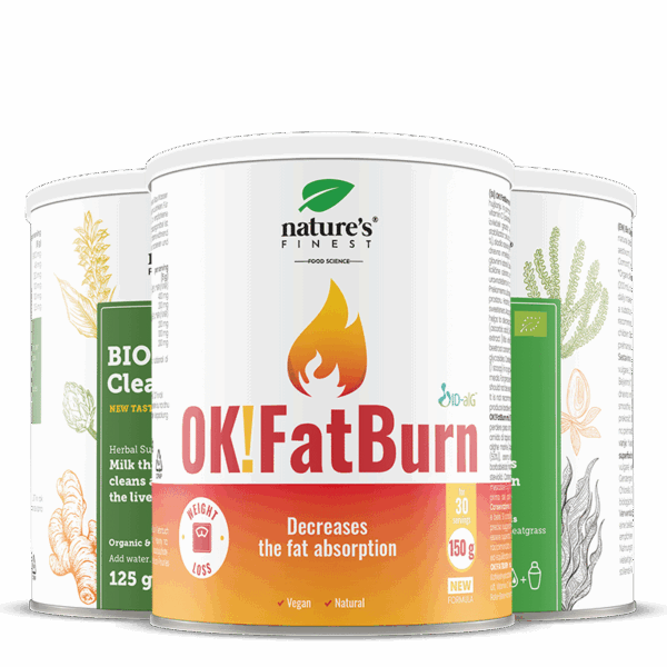 Ok!FatBurn: vitamín C, ID-alG ™, L-karnitín, L-tyrozín, LIVER CLEANSE Pestrec mariánsky, prášok zo schisandry, prášok z kurkumy, extrakt z artičokov. Bio DETOX Pšeničná tráva, spirulina, chlorella, jačmenná tráva, turecký med.