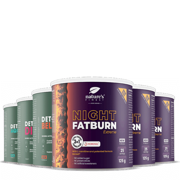 • Night Fatburn Extreme: Formula, ktorá podporuje chudnutie a pomáha stabilizovať telesnú hmotnosť⁶. Obsahuje patentovanú formulu Morosil®, extrakt z červeného vína, L-karnitín a extrakt z valeriány lekárskej, ktorá pomáha udržiavať prirodzený spánok a prispieva k optimálnej relaxácii.