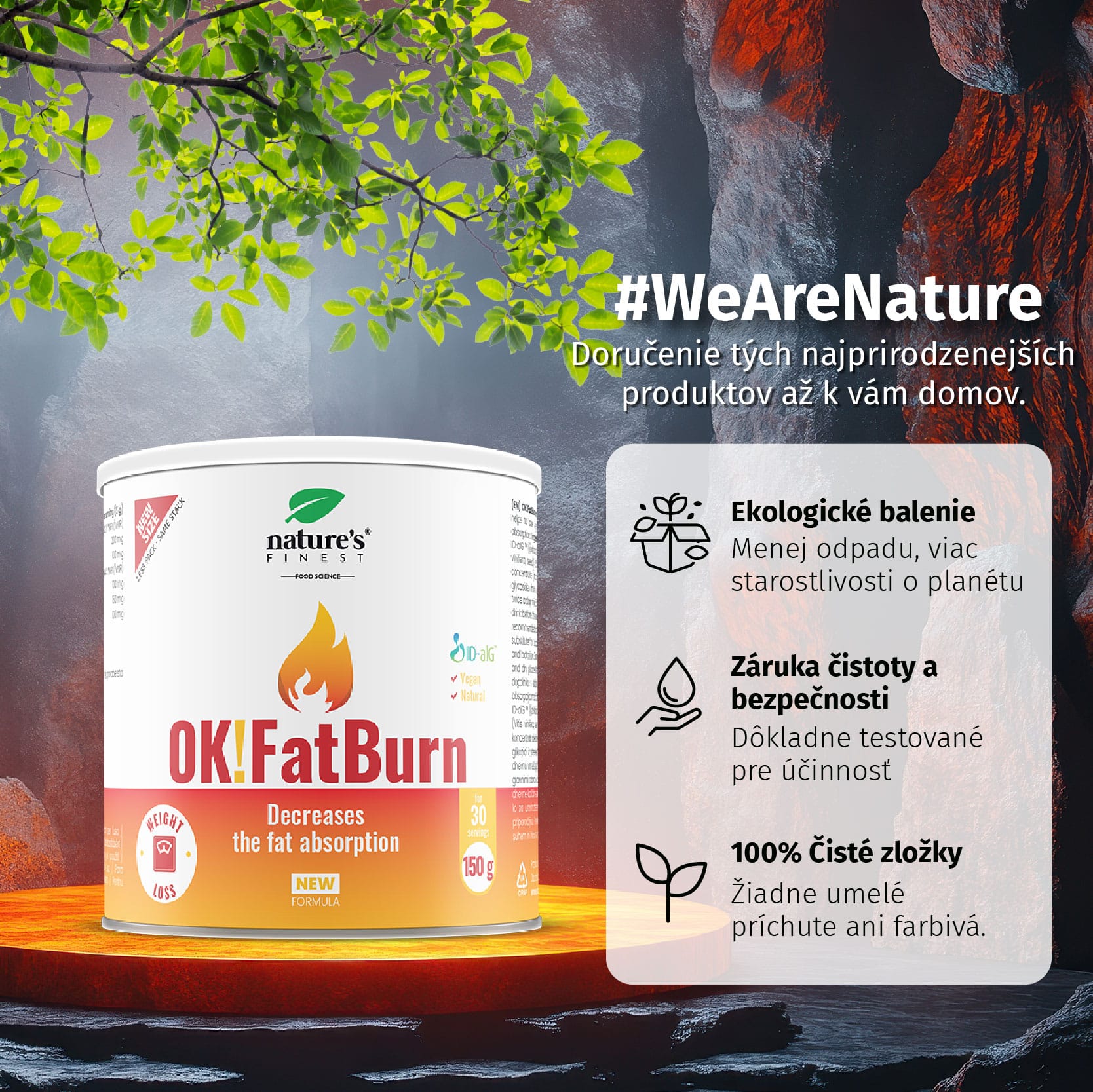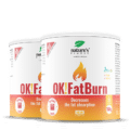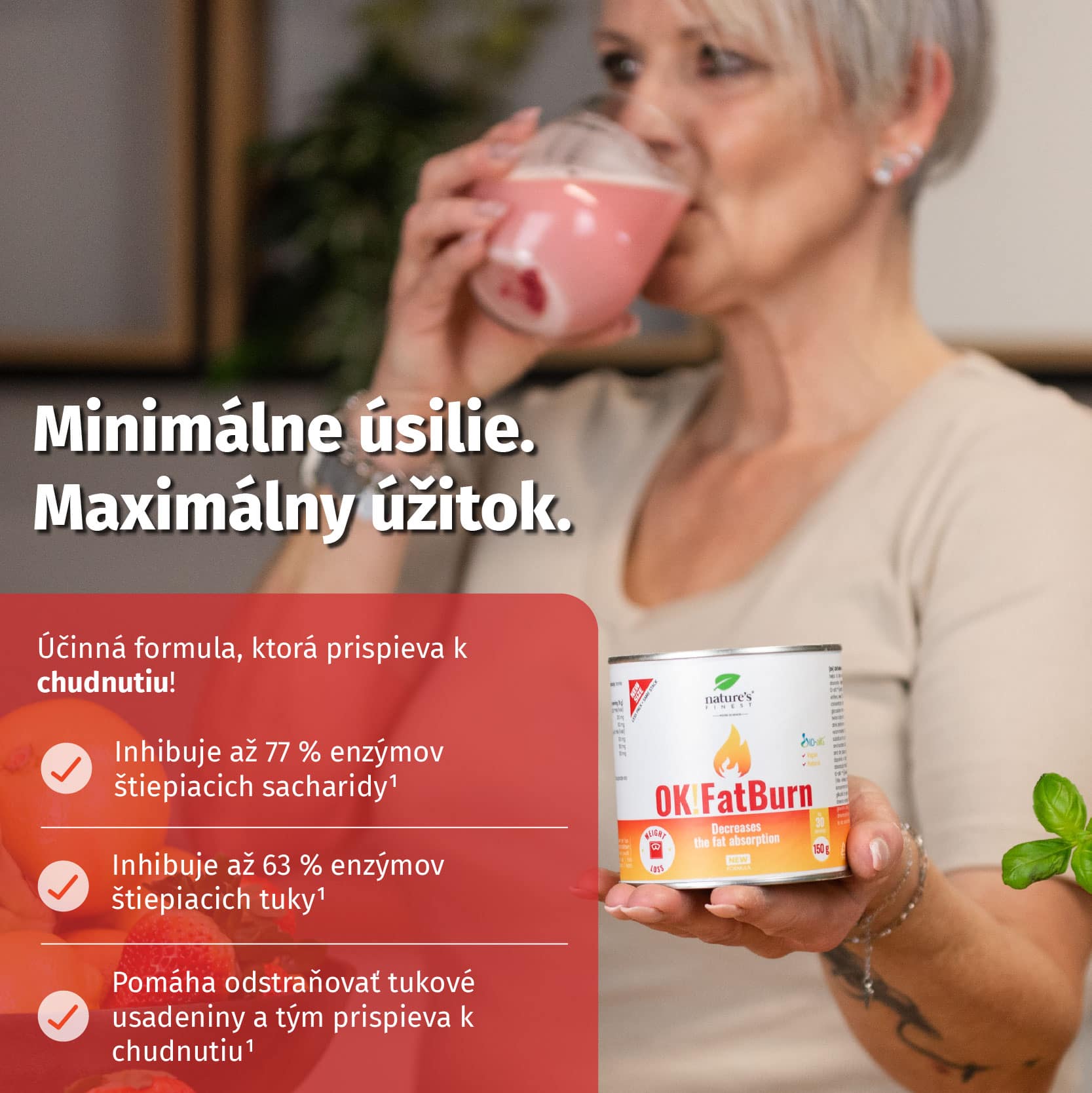 OK!Fatburn je účinná formula na chudnutie, ktorá potláča enzýmy tráviace sacharidy a tuky pomocou ID‑alG™. Trojitý účinok formule prispieva k normálnemu metabolizmu, ktorý vyrába energiu⁴, s extra silou L‑tyrozínu a L‑karnitínu. Štúdie potvrdzujú viditeľné chudnutie spojené so znížením tukovej hmoty.¹