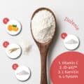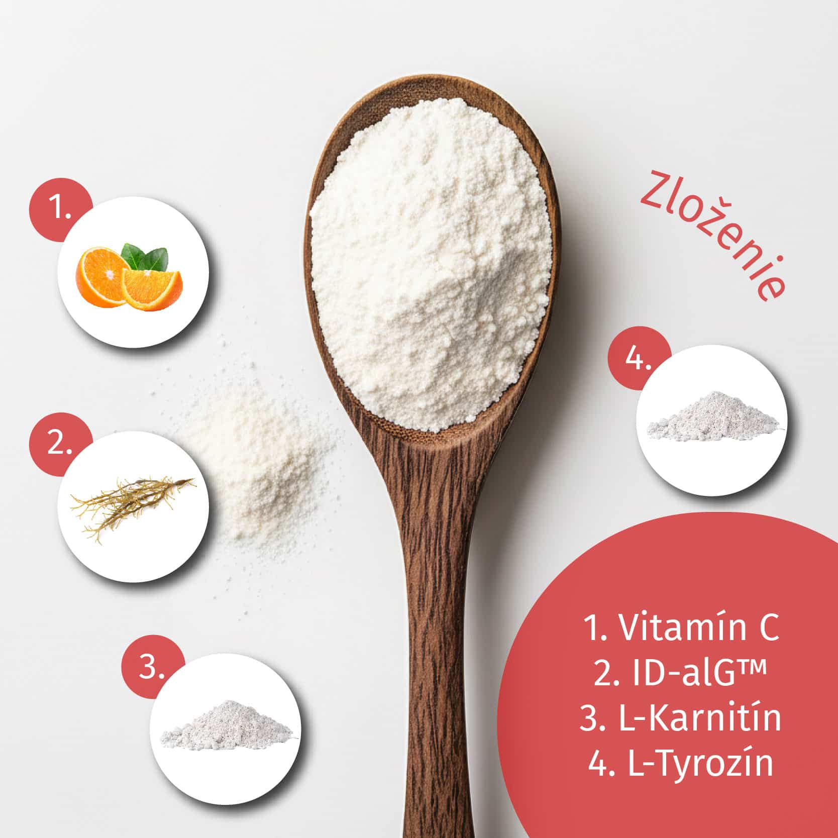Kukuricový škrob, sladidlo erytritol, vitamín C (kyselina askorbová), ID‑alG™ [(extrakt morskej riasy (Ascophyllum nodosum), práškový extrakt z hroznových semien (Vitis vinifera))], citrónová aróma (4 %), L‑karnitín, L‑tyrozín, stabilizátor: celulóza, koncentrát z červenej repy (maltodextrín, prášok z červenej repy (Beta vulgaris)) (1,5 %), sladidlo: steviol glykozidy zo stévie