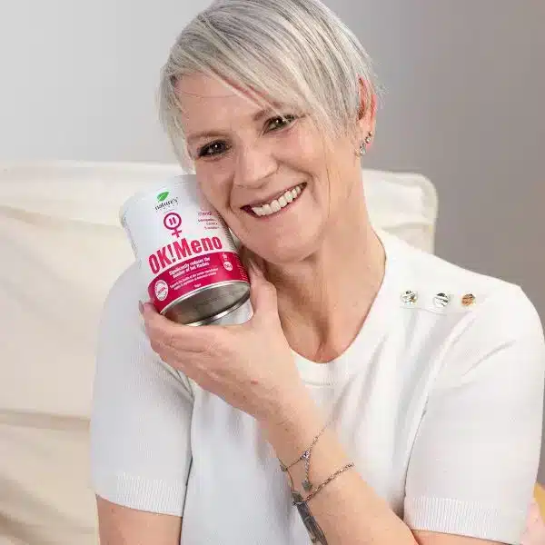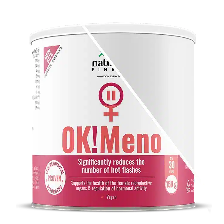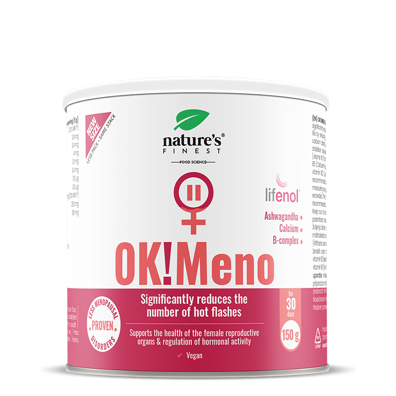OK!Meno pomáha ženám v menopauze zlepšiť kvalitu života už za 6 týždňov¹*. Obsahuje patentovaný Lifenol®, ktorý znižuje návaly horúčavy a nočné potenie¹*, ašvagandu pre emocionálnu podporu a vápnik pre zdravie kostí – všetko v jednej komplexnej formule podporenej štúdiami.