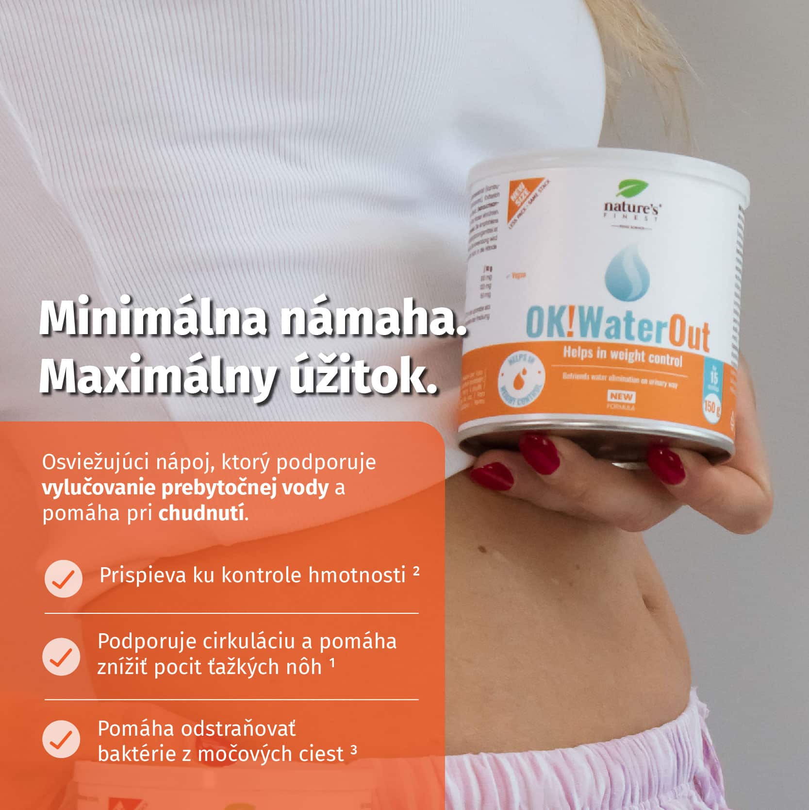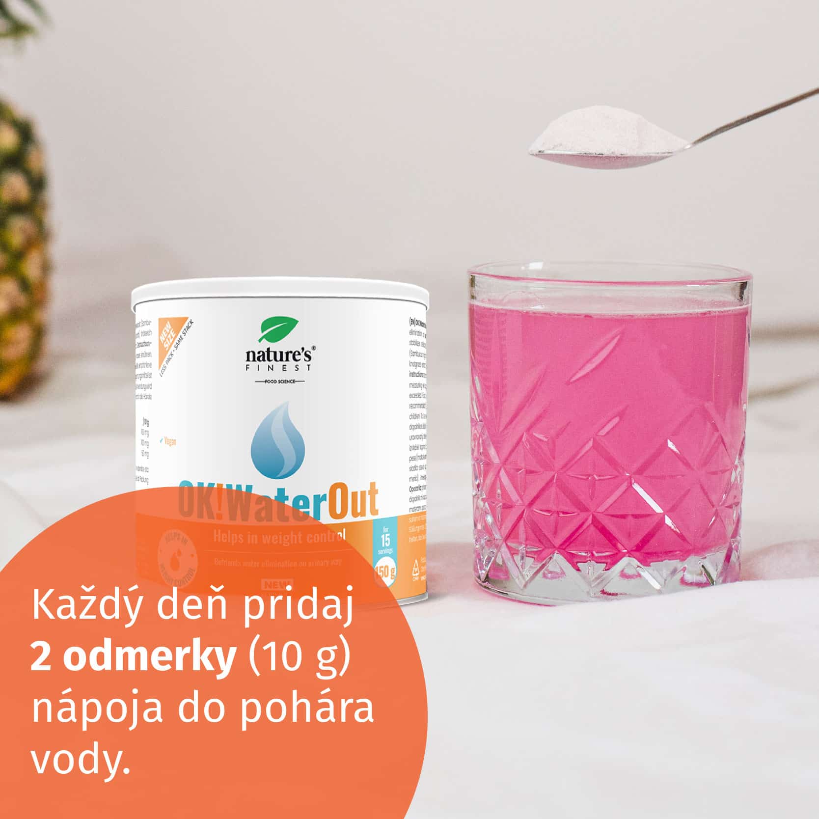 Každý deň si do pohára vody dávkujte 2 odmerky (10 g) nápoja OK!WaterOut. Jedna odmerka obsahuje 100 mg extraktu z listov žihľavy, 100 mg extraktu z bazy a 50 mg extraktu z rdesna.