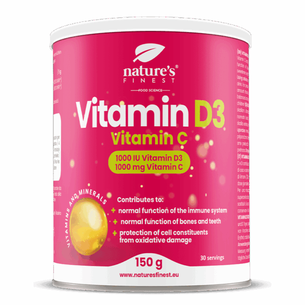 S týmto práškom vitamínu D3 a vitamínu C zabezpečujeme najlepšiu absorpciu, ktorá začína hneď po konzumácii. Primárnou úlohou vitamínu D je udržiavať homeostázu a konštantnú koncentráciu vápnika a fosfátov v plazme a vitamín C pôsobí ako silný antioxidant.